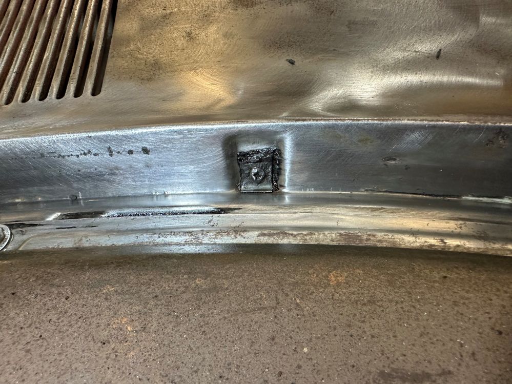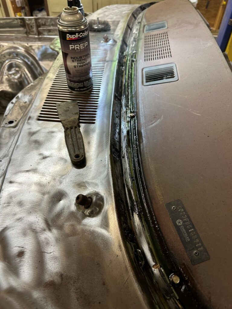 Okay. Engine compartment cleaned, rust holes fixed, and bent support fabricated and replaced. Time to move to the cowl. I used the compressor to blow about 20 pounds of history out of drain holes to either side of the cowl. Just when I thought there was no more, a change of the direction of the nozzle loosened another decade’s worth of crap.