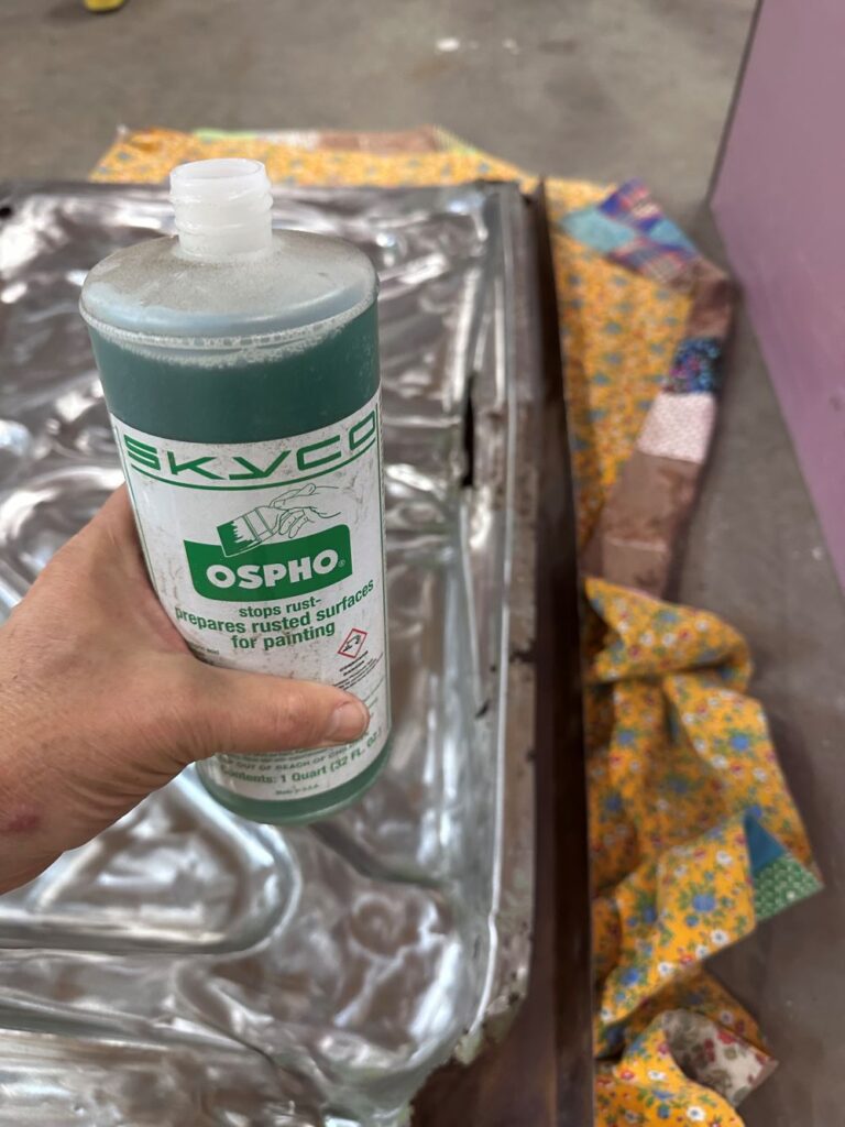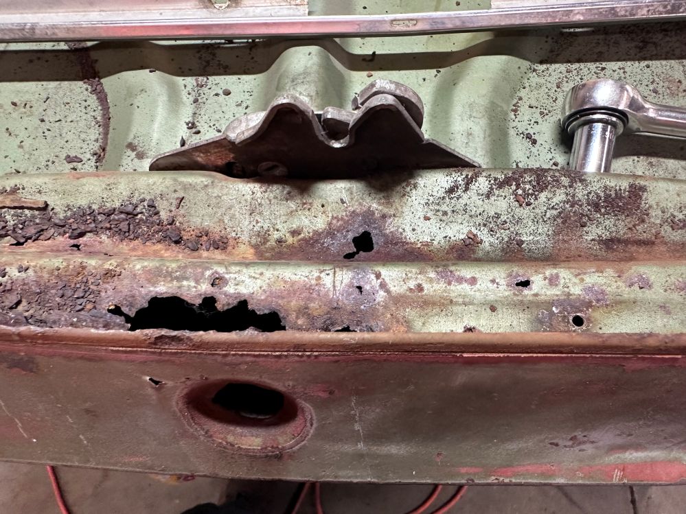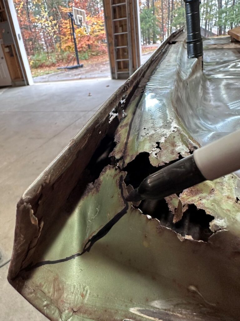 While I had the end off, I tried to clean out as much of the rust and junk that had accumulated in between the top and bottom panels of the trunk. I used long wire brushes and lots of compressed air to clean it out. Then…