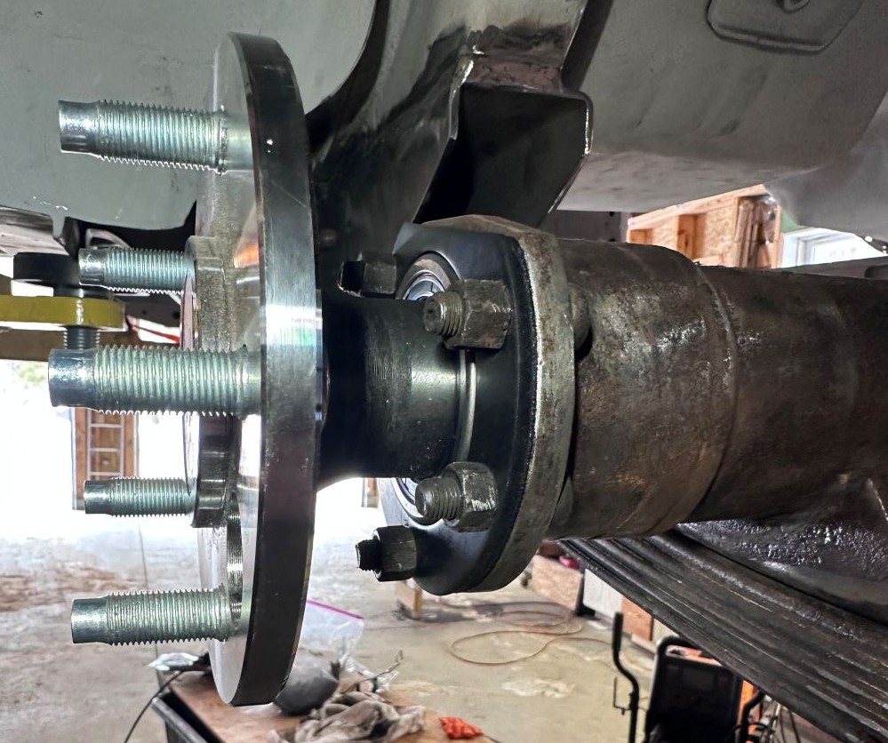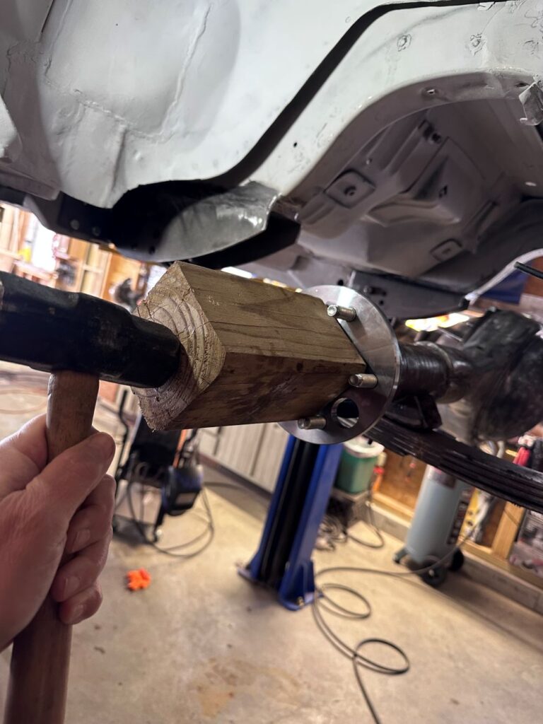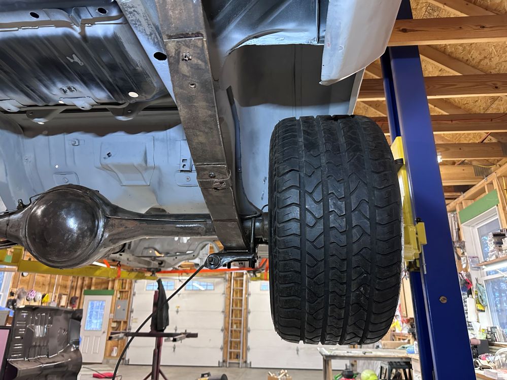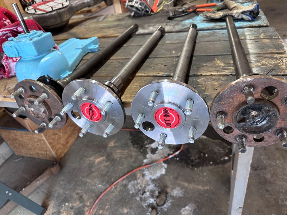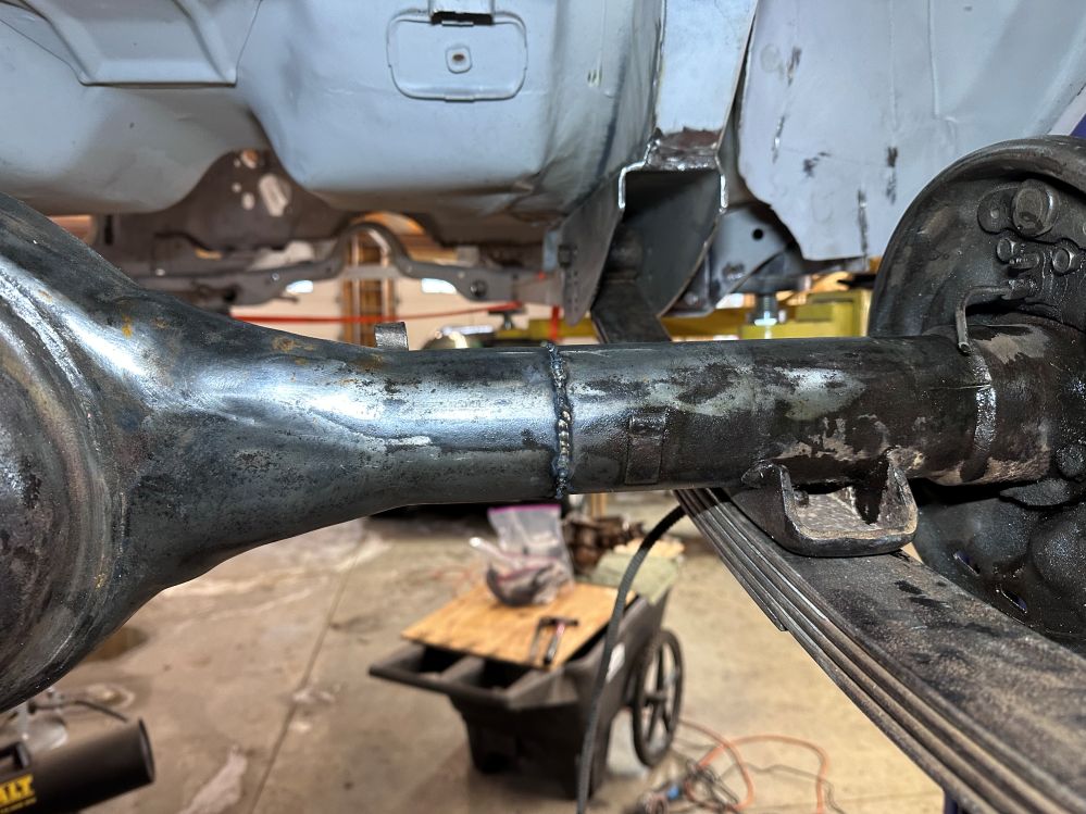 I had located slotted wheels for the back end that were similar to those I had on my high school car. Unfortunately, these 10″ wide wheels had only 3 1/2″ backspacing, which caused them to stick out of the wheel wells by … well, too much. Therefore, I decided to 1) relocate the rear leaf springs inward by four inches (using a relocation kit), and then 2) shorten the axle housing by the same amount (and purchase shortened axles to stuff into the shortened axle housing).